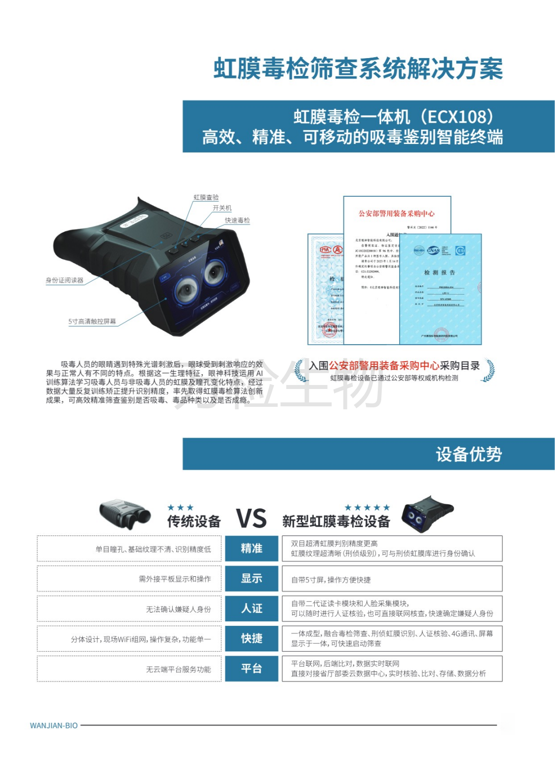 江苏万检生物科技有限公司 ——全球毒品检测技术创新领军者 科技赋能 守护无毒未来 作为全球毒品检测领域的标杆企业,万检生物以尖端生物技术为内核,深耕毒品检测试剂、智能诊断仪器、食药环检测及全场景解决方案的创新研发、精益生产与全球化市场拓展。依托“精准医学+公共安全”双轮驱动战略,我们致力于为全球禁毒事业构建科技防线。 核心优势 技术壁垒突破者 搭建国际领先的抗原抗体技术研发矩阵,拥有自主知识产权的纳米标记技术与AI算法驱动的智能判读系统; 独创"多模态毒品检测技术平台",覆盖免疫层析、干式生化、分子诊断三大技术路径,检测灵敏度达国际最高标准(ng/mL级); 全场景解决方案专家 - 产品矩阵涵盖11大类300+检测项,精准识别传统毒品、新精神活性物质(NPS)、麻醉药品及合成致瘾物; - 提供从便携式快检试剂到实验室级联用设备的全链条产品生态,满足司法鉴定、边境管控、医疗戒断、职场筛查等多元化场景需求; 使命与愿景 我们以"用科技之光守护人类健康与安全"为核心理念,持续加码研发投入(年均营收25%),携手中南大学、中国医科大学、苏州大学等顶尖机构开展产学研深度合作。未来五年,将重点突破毒品痕量检测卫星网络与区块链溯源系统,推动全球禁毒治理向数字化、智能化时代迈进。 |